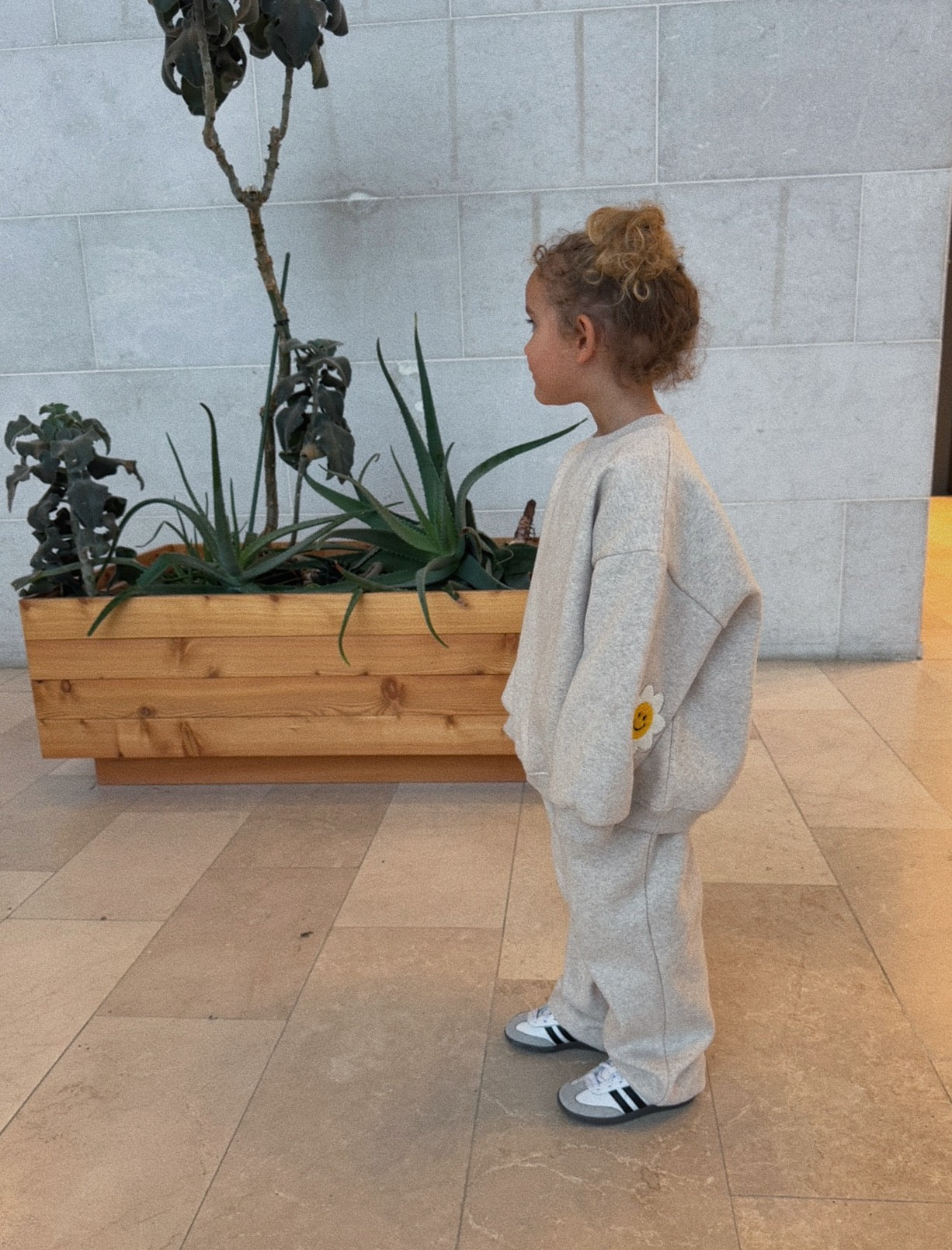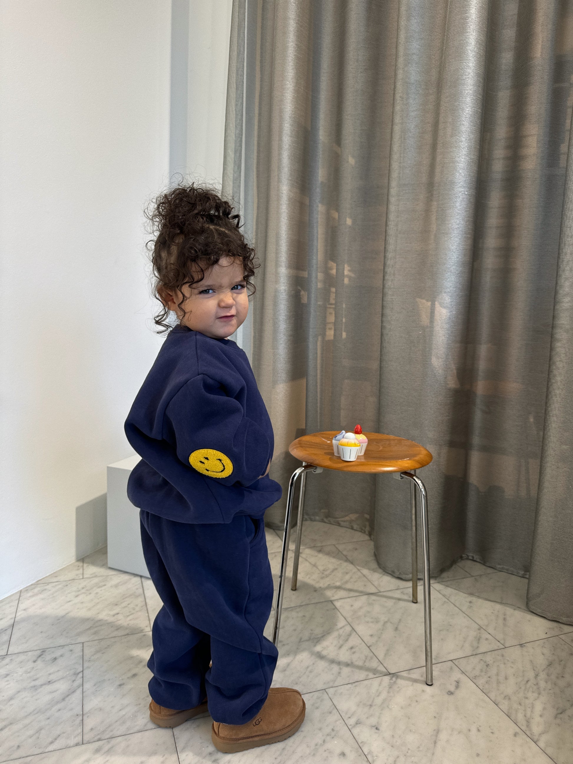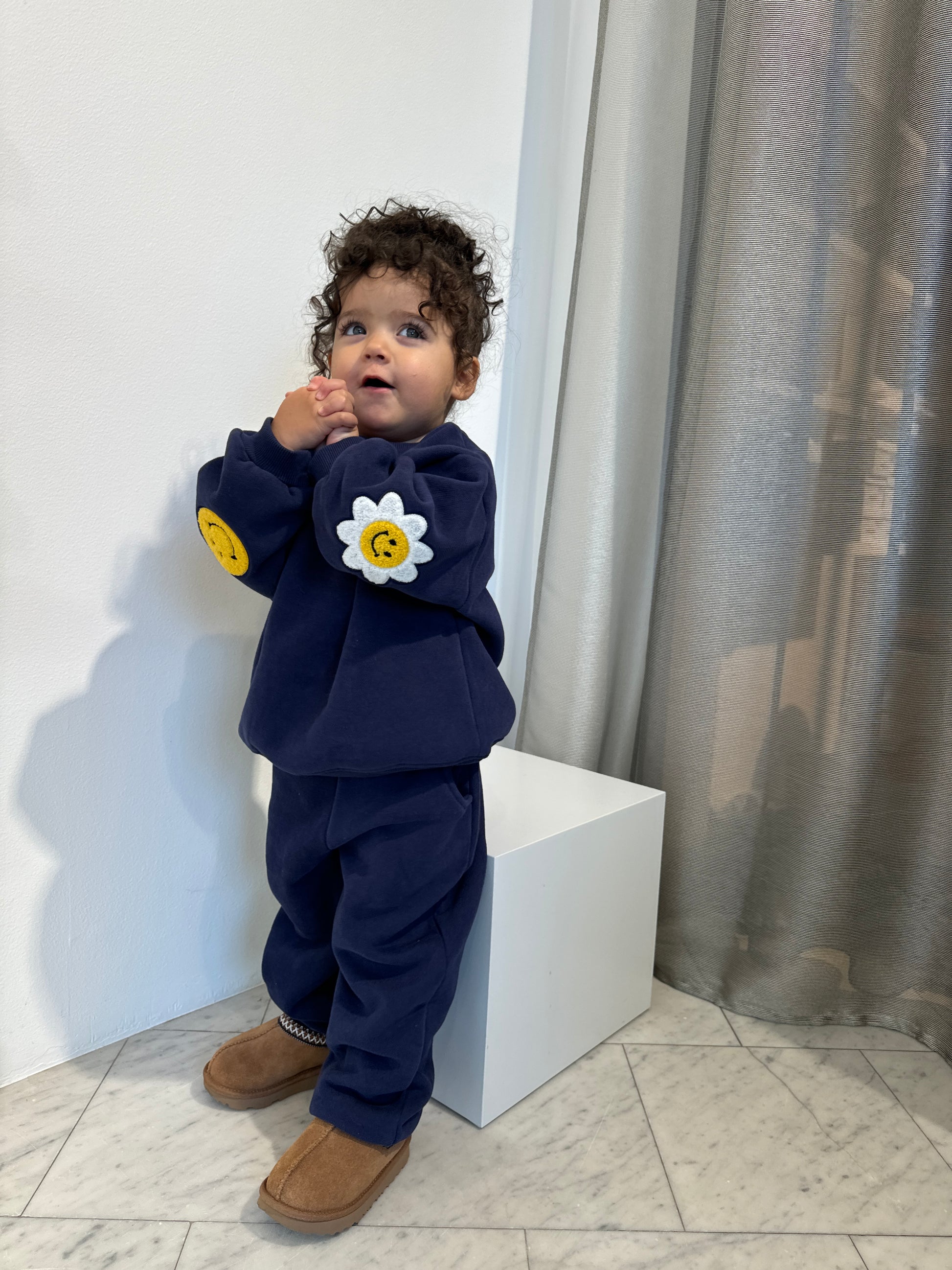 Super soft and thick sweatset (top & bottom) in 100% cotton with trendy smiley elbow patches.