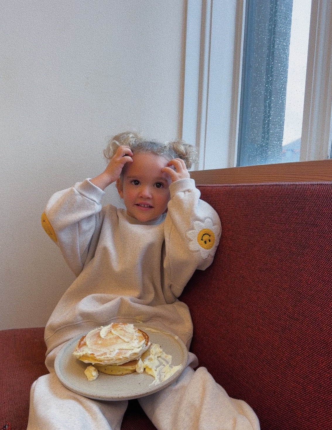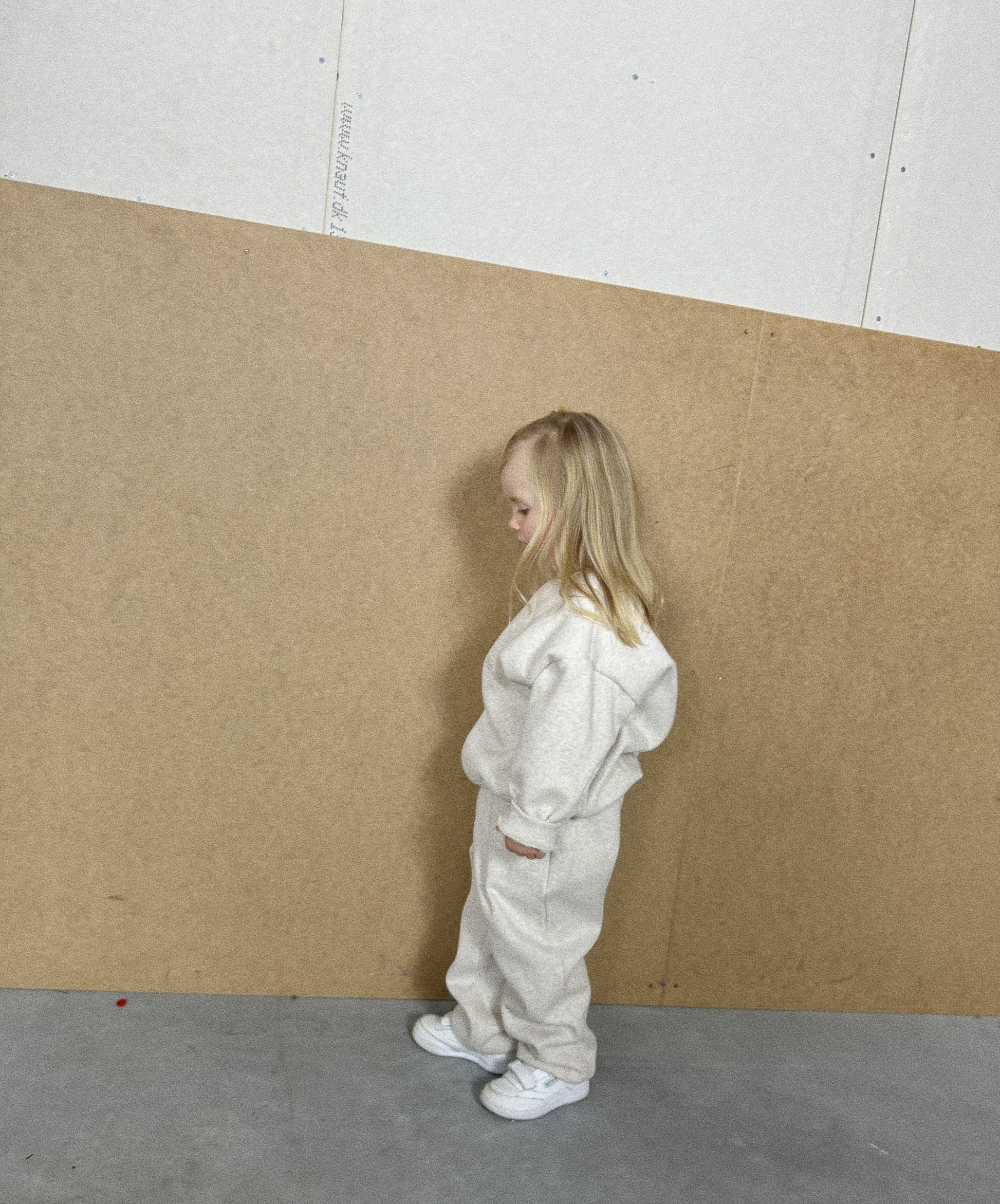 Billie in the beige set is 3 years old and wears size L.