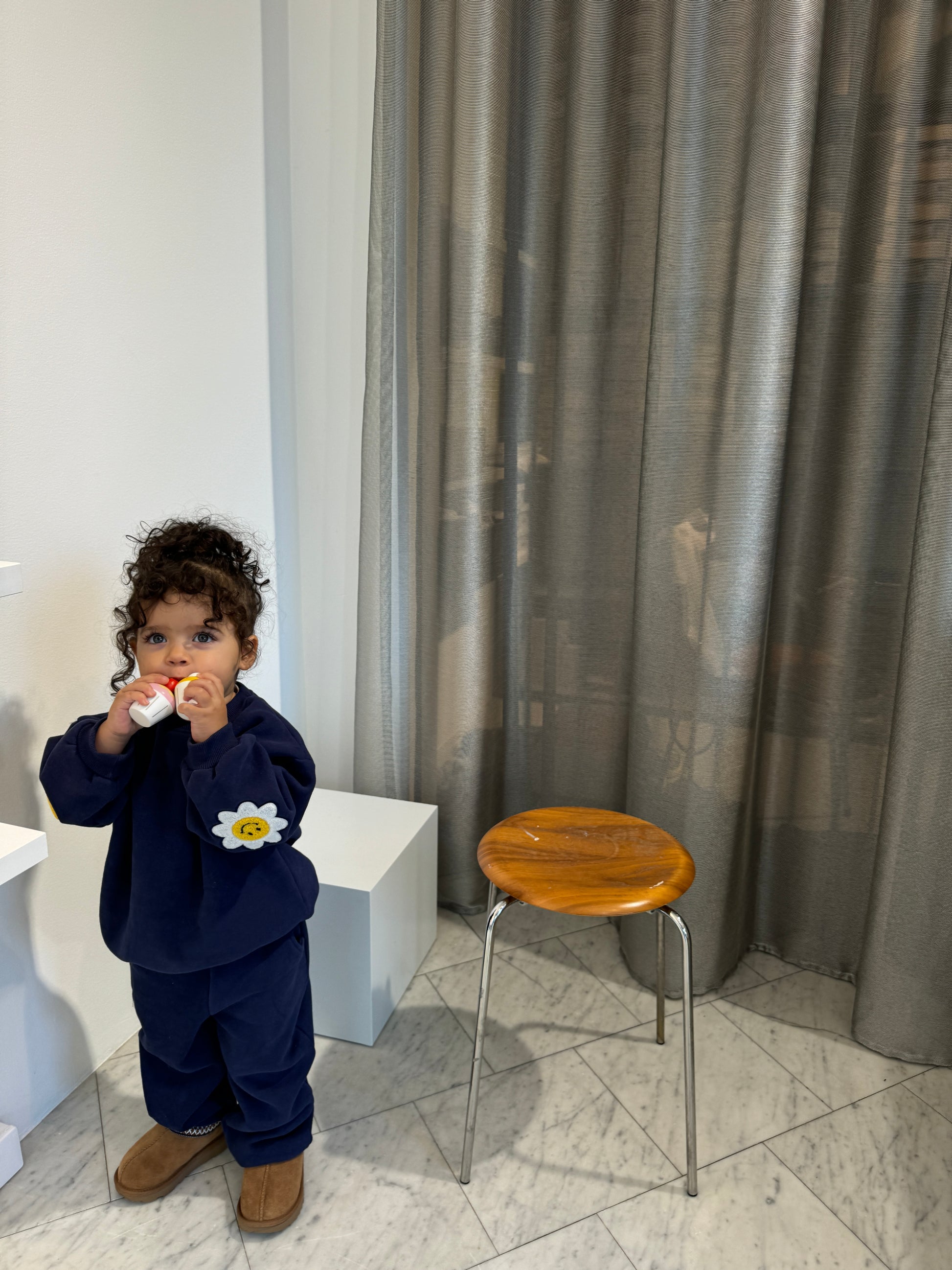 Flora in the navy set is 2.5 years old and is wearing size M.